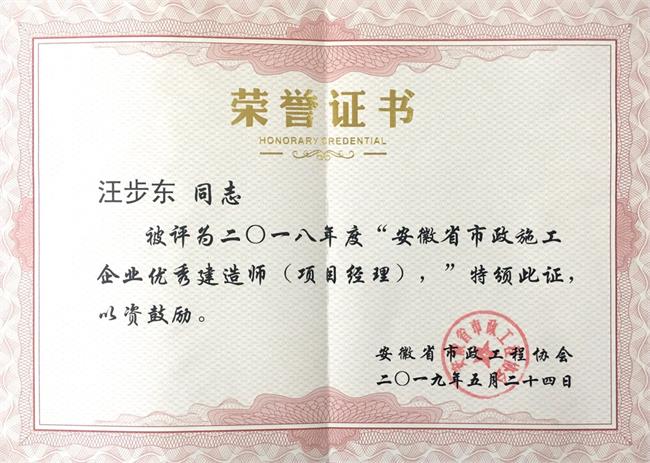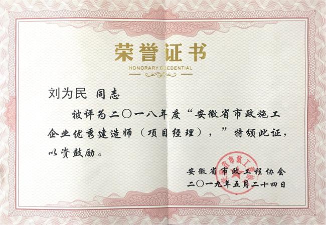 集團(tuán)公司劉為民、汪步東兩同志榮獲2018年度“安徽省市政施工企業(yè)優(yōu)秀建造師(項(xiàng)目經(jīng)理)”榮譽(yù)稱號(hào)。