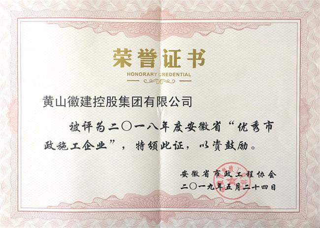 黃山徽建控股集團(tuán)有限公司榮獲2018年度“安徽省優(yōu)秀市政施工企業(yè)”榮譽(yù)稱號(hào)。